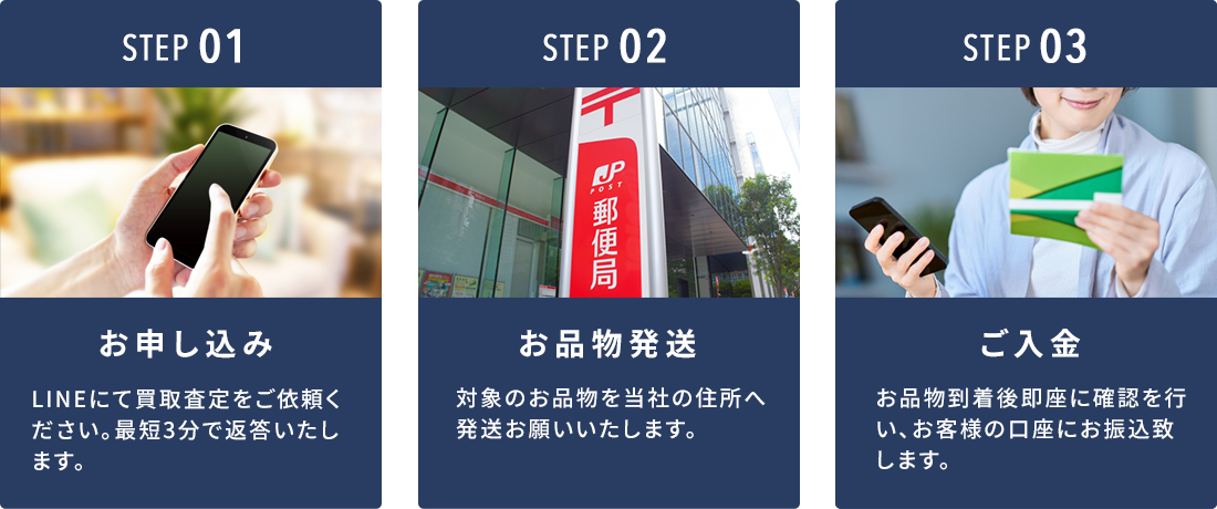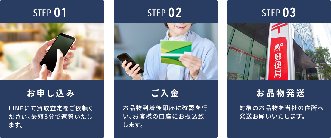 お申し込みは、当店のLINEアカウントを登録いただき必要な情報を送信するだけで即日に査定結果と買取金額をご案内いたします。